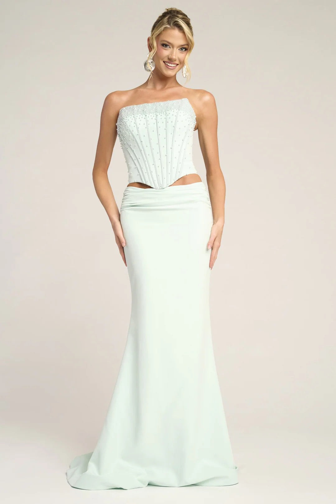 Make a bold statement in the Portia & Scarlett PS26007, a sophisticated two-piece gown designed for modern elegance. Crafted from smooth crepe, this fitted silhouette features a structured corset that beautifully defines the waist.