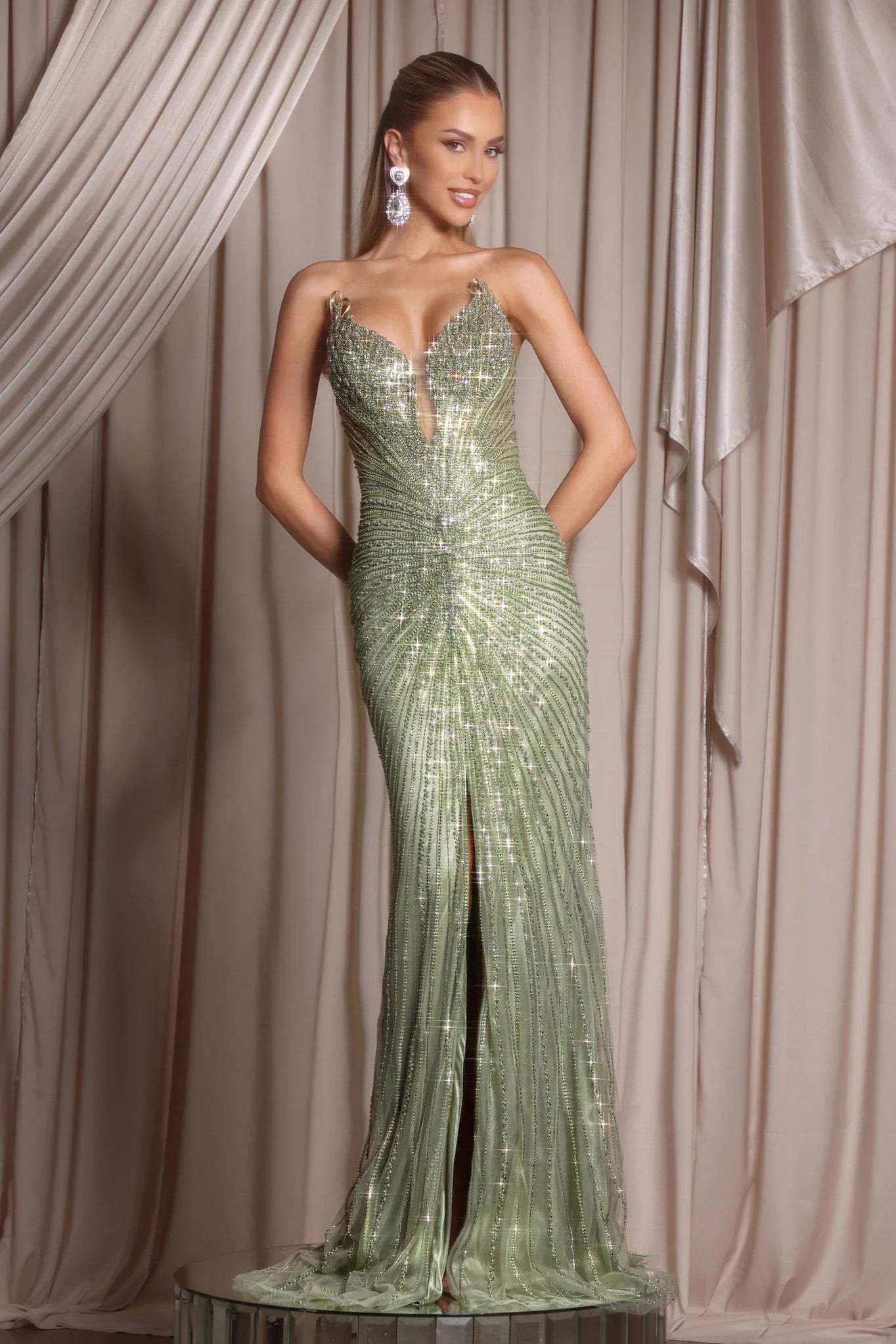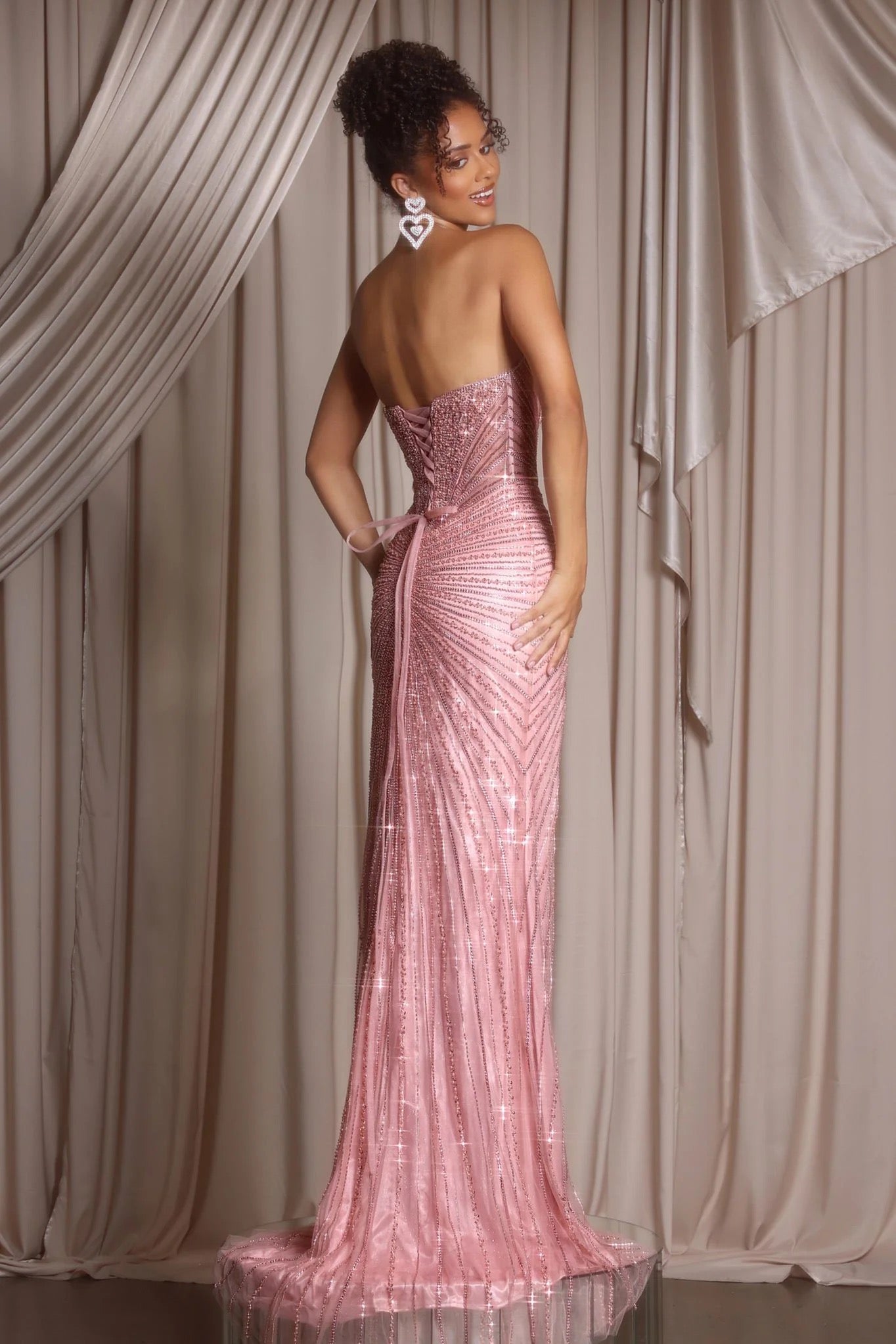 Make a striking entrance in the Portia & Scarlett PS26012, a luxury beaded gown designed to sculpt and captivate. The fitted silhouette highlights your curves, while the plunging sweetheart neckline and corset lace-up back create a flawless, customized fit. Finished with a bold high slit, this gown is perfect for prom nights and unforgettable evening events.