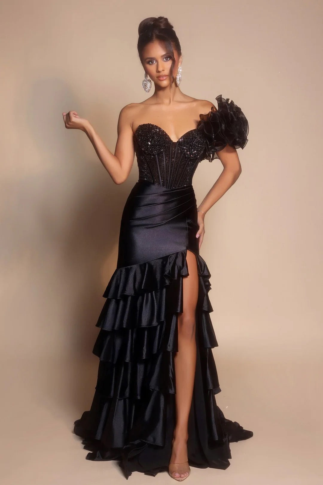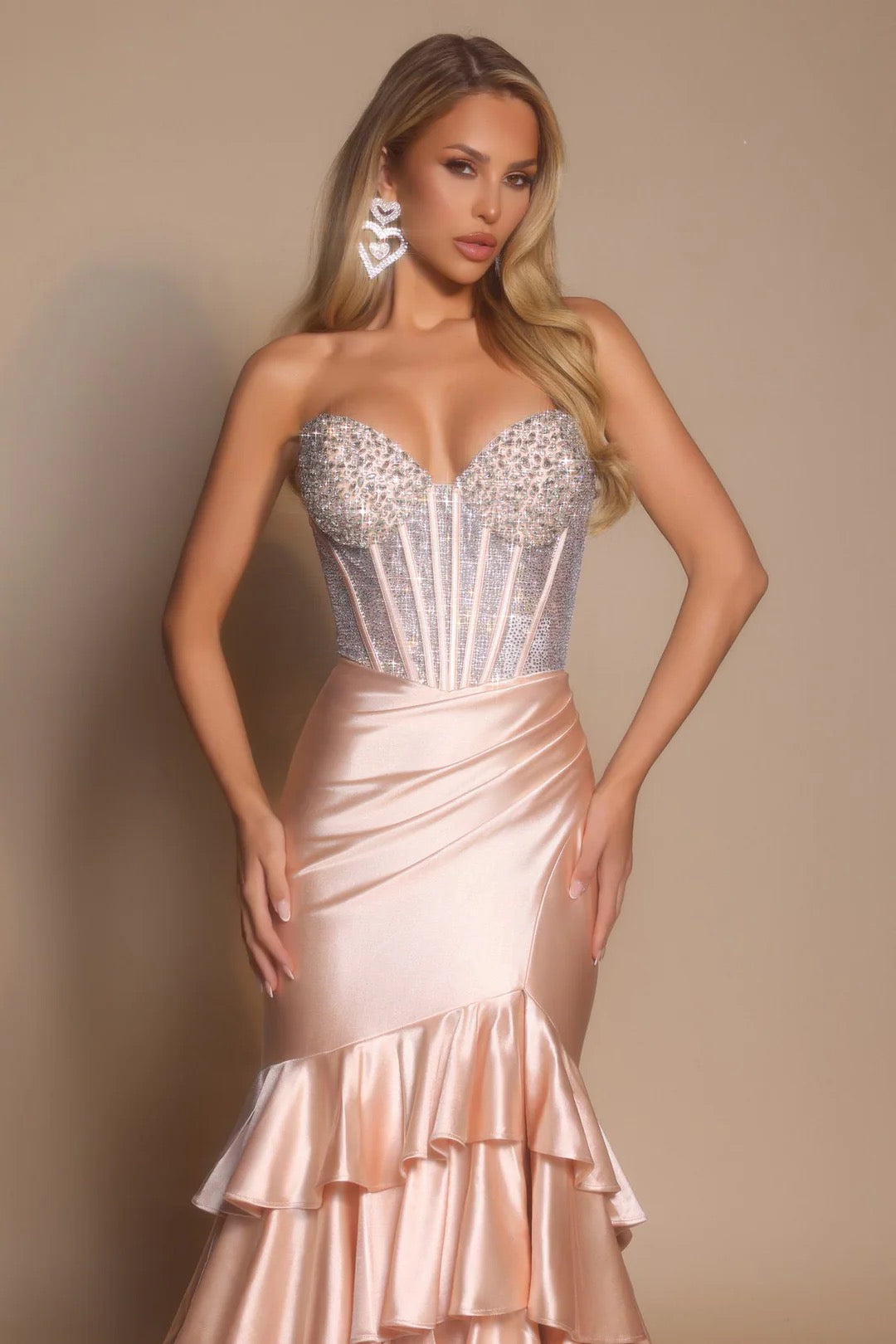 A sculpted evening gown designed for unforgettable entrances. Crafted from premium Lycra, the PS26141 hugs the body with a smooth, structured fit that enhances every curve. The strapless sweetheart neckline and corset construction define the waist, while cascading ruffles add soft movement and high-fashion drama. Finished with a secure zipper back for all-night confidence, this gown is made for proms, galas, and black-tie moments. Timeless, refined, and unmistakably luxurious.