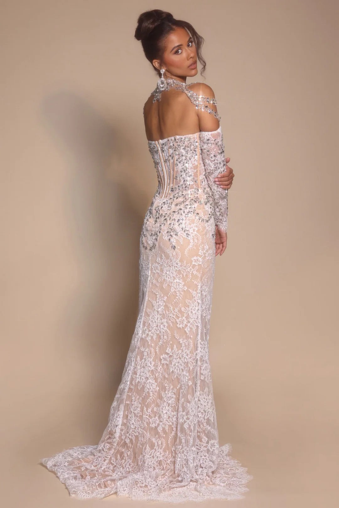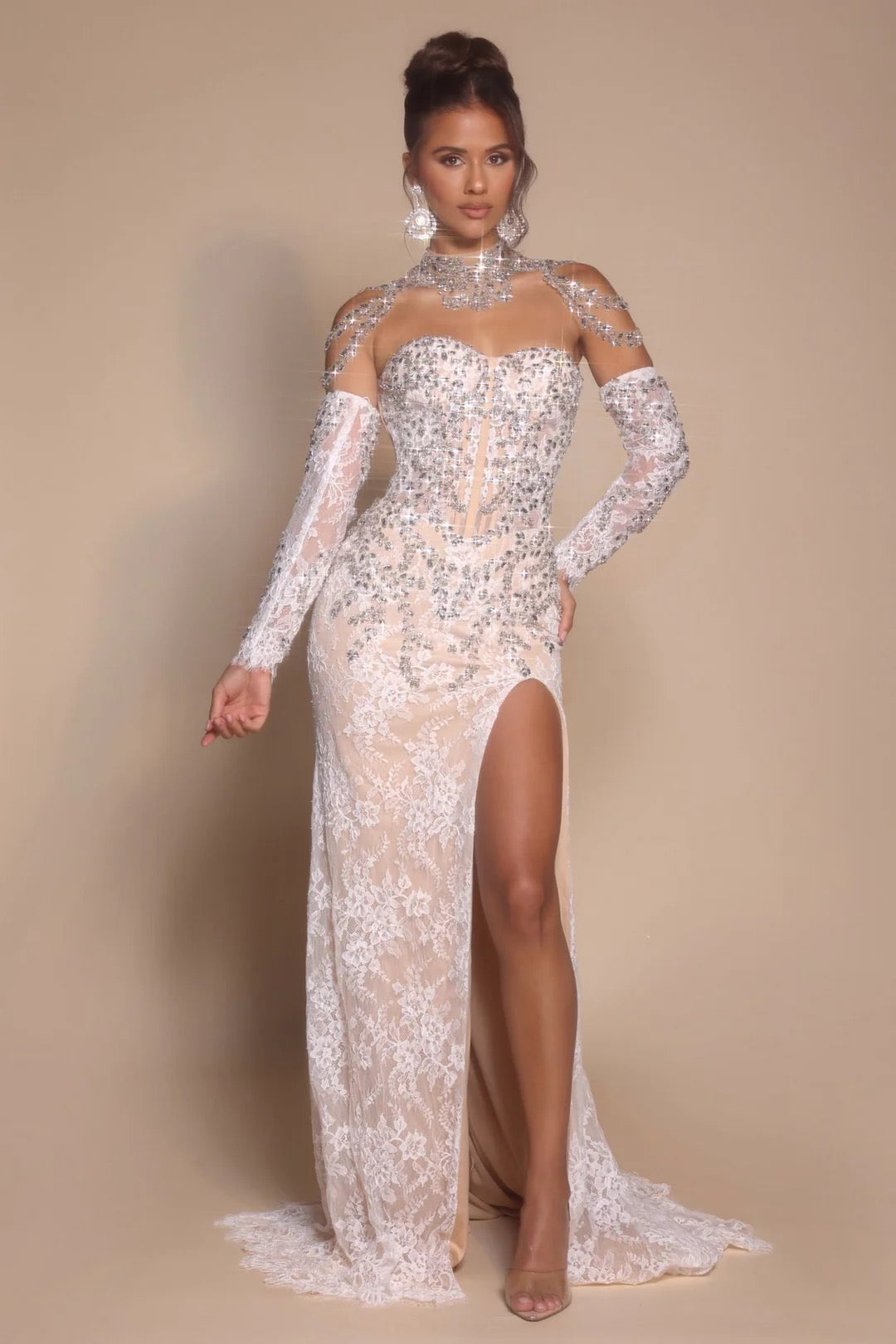 Step into timeless elegance with this Portia & Scarlett fitted lace gown, designed for unforgettable evenings and winter-wonderland moments. Crafted from luxurious lace with an embellished neckline and structured corset bodice, this long evening dress delivers a sculpted, feminine silhouette that photographs beautifully from every angle.