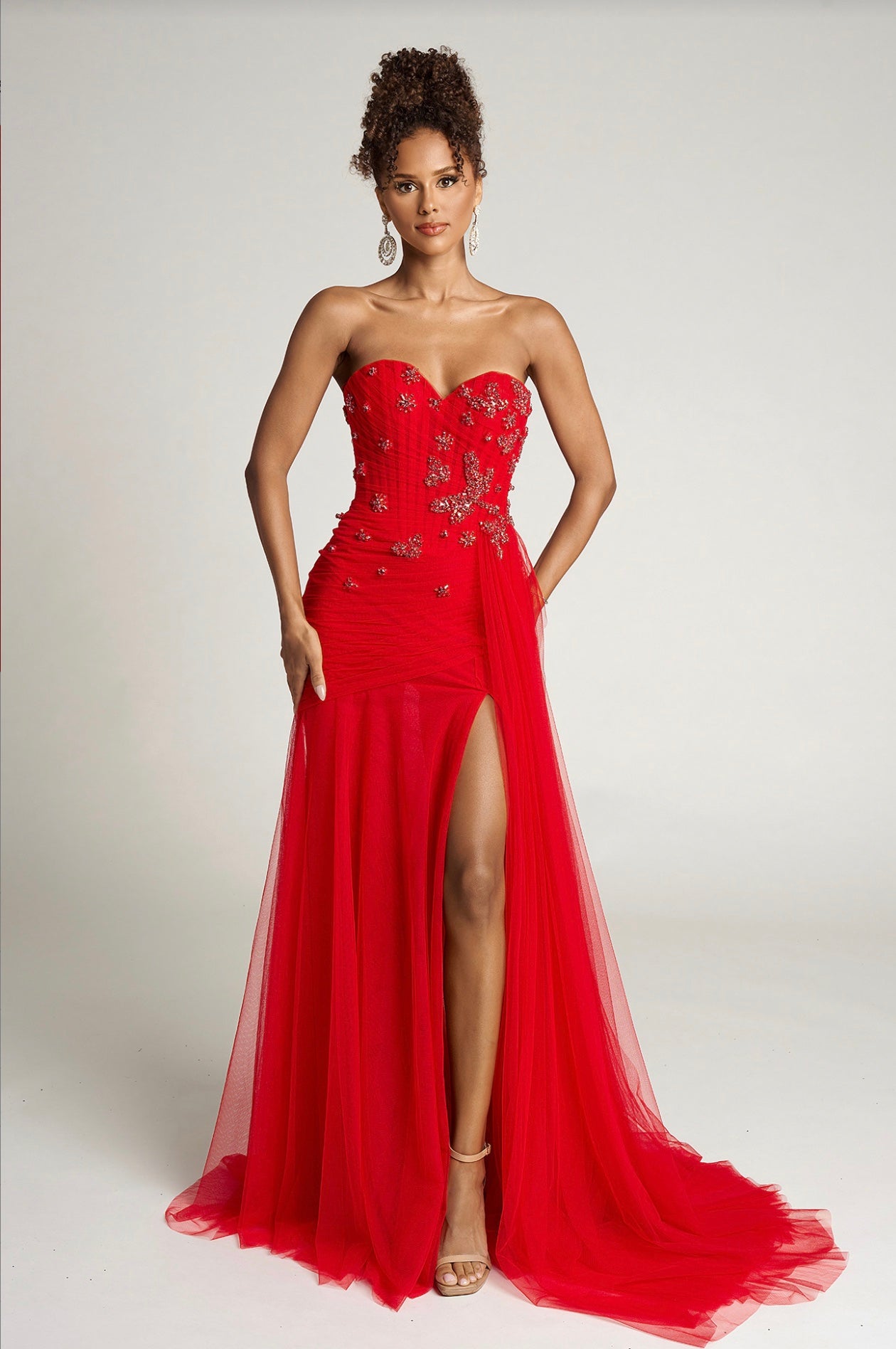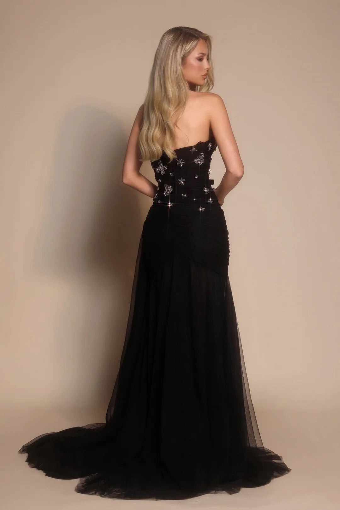 Make an unforgettable entrance in this stunning Portia & Scarlett evening gown, designed for girls who want to turn heads the moment they walk into the room. Crafted from premium tulle, this dress combines elegance, structure, and glamour—perfect for prom, formal events, and every occasion where you want to make a statement.