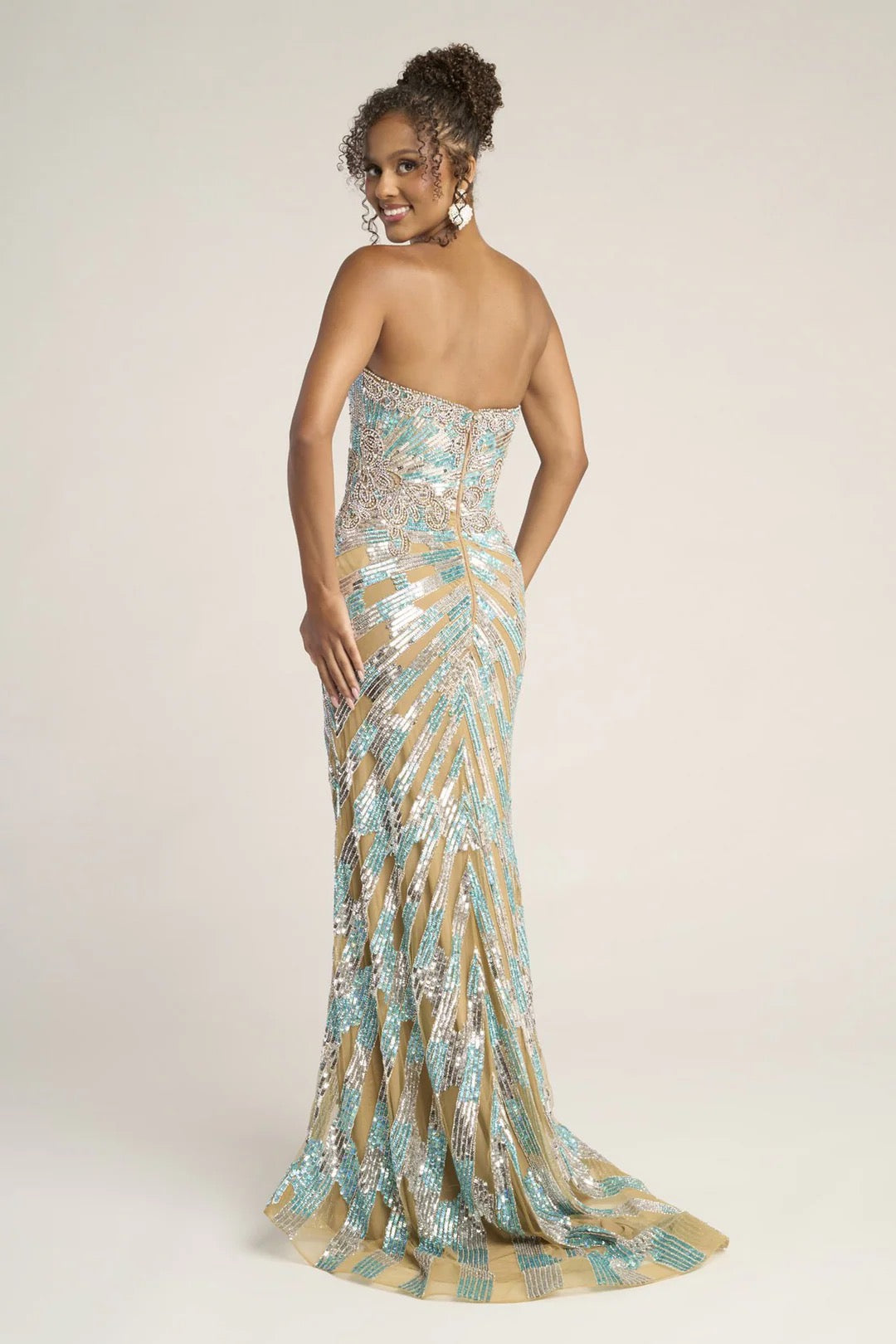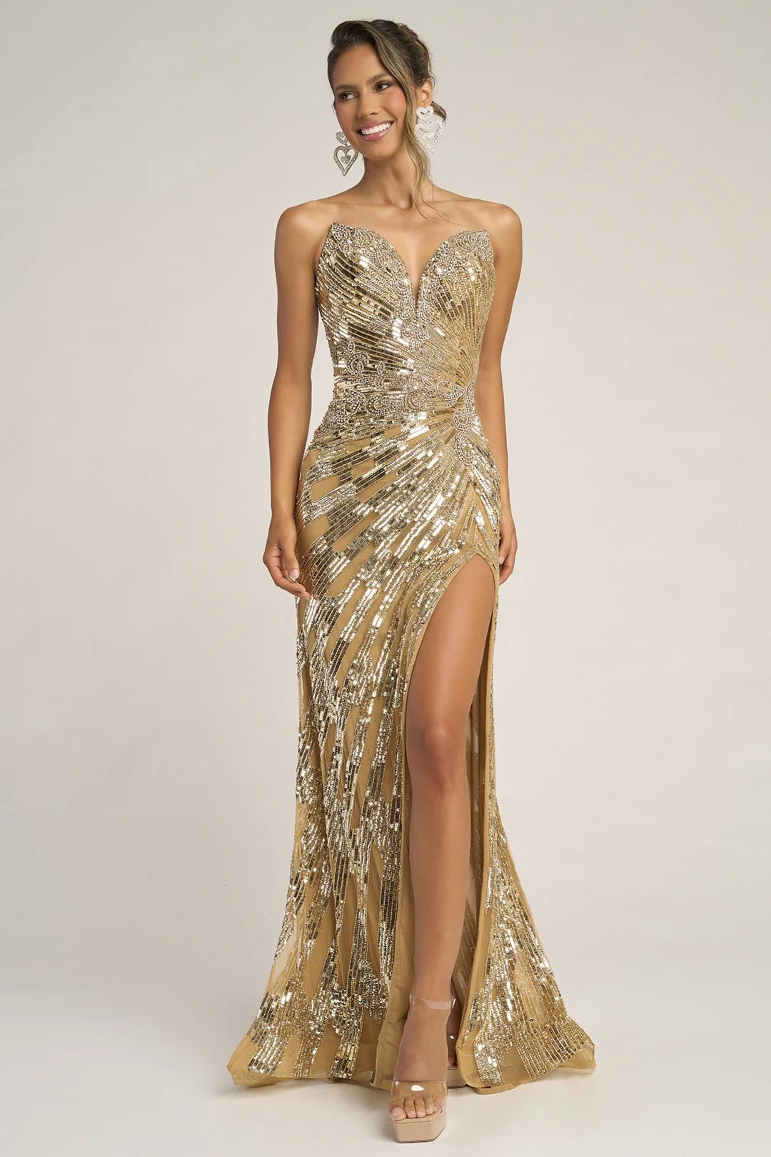 This fitted, beaded gown is designed to sculpt and flatter, hugging your curves with a structured corset that feels both powerful and feminine. The strapless V-neckline highlights your décolletage, while the floor-length silhouette moves effortlessly with you. Finished with a hidden back zipper for a seamless fit, this dress is made for unforgettable entrances and moments that linger long after the night ends.
