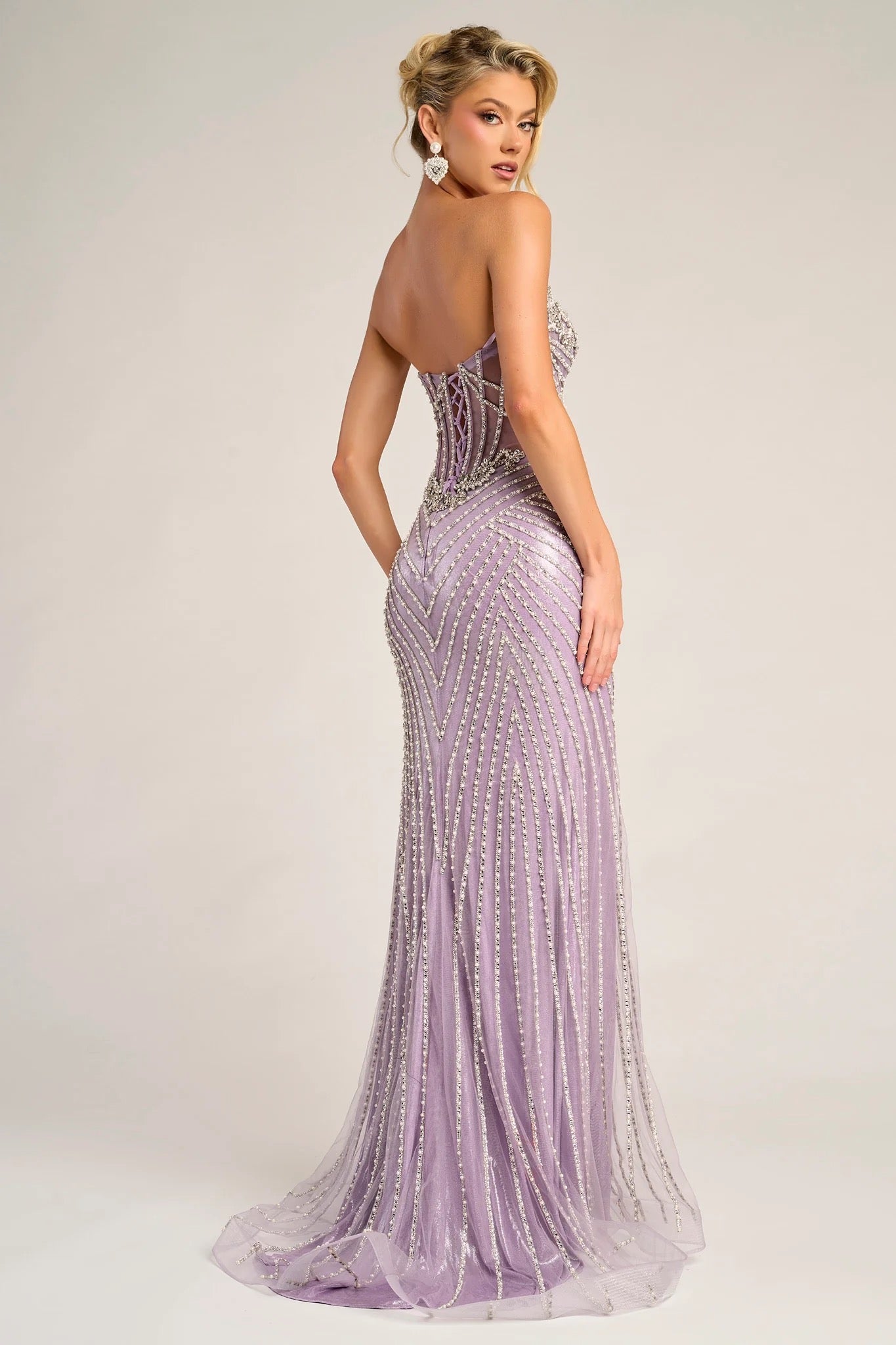 XO057 features a strapless sheer corset bodice with exposed boning and intricate bead detailing. The fitted skirt is designed with cascading linear embellishments that elongate the figure and lead into a thigh-high slit. Finished with a lace-up back, this gown offers a flawless balance of structure and sparkle.